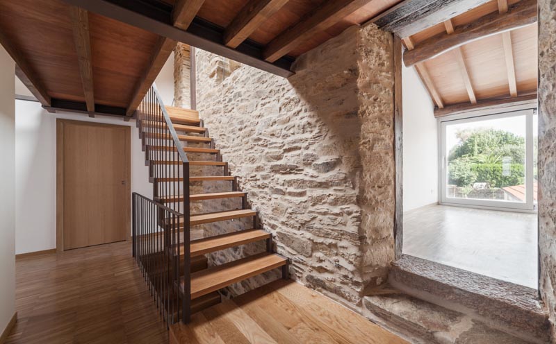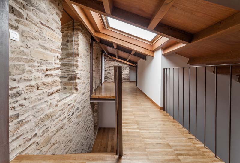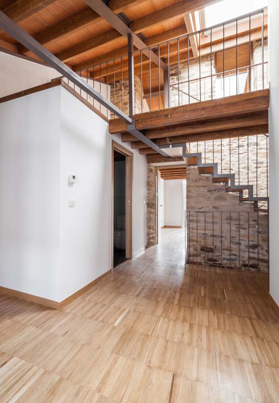Se conserva el sistema estructural tradicional, basado en muros de carga perimetrales sobre los que descansan un forjado de madera laminada en su planta primera, y vigas metálicas y perfiles laminados tipo HEB en cubierta. En planta baja se opta por el empleo de una solera ventilada tipo caviti. Por su parte, la escalera se resuelve con una estructura de acero y peldañeado de madera de roble maciza.