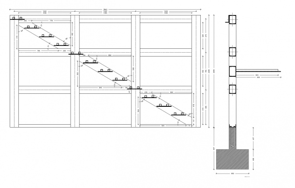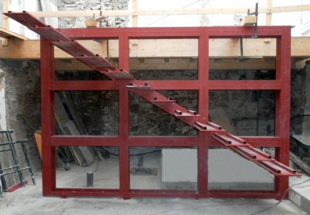 La estructura de acero laminado es realizada en taller empleando perfiles UPN 180. Así mismo, los peldaños se ejecutan con chapas de acero de 10 mm de espesor y dos perfiles tubulares de dimensiones 40.40.3.