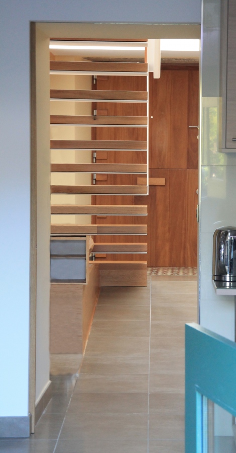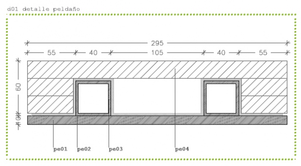 Su estructura metálica de acero galvanizado conformada por perfiles UPN, sustenta un peldañeado formado por perfiles tubulares y chapas de acero, que al igual que los pasamanos se cubren con tableros de madera de roble.