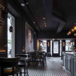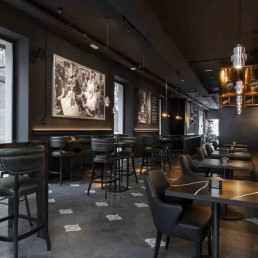 Espejos infinitos abrazan las paredes del local, turbinas de acero colgantes e iluminación indirecta crean una atmósfera genuina en la que juegan un papen los tonos negros. Una sobria elegancia que recorre cada rincón del Hemingway.