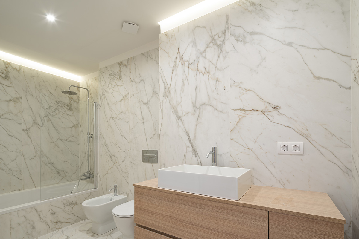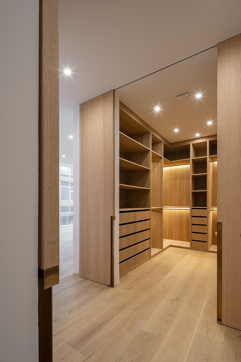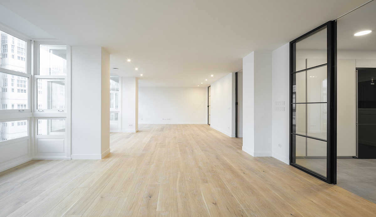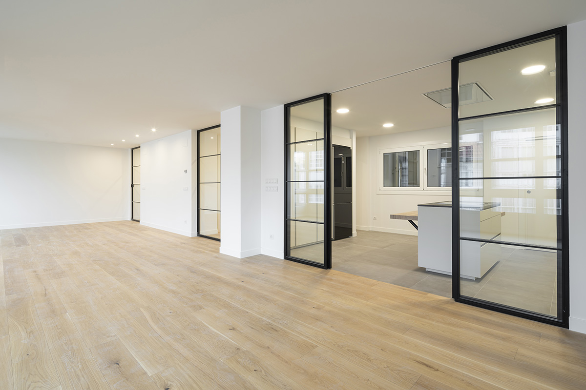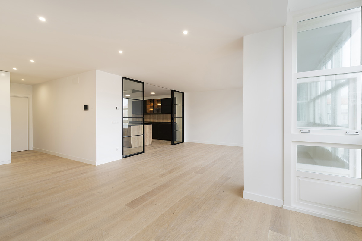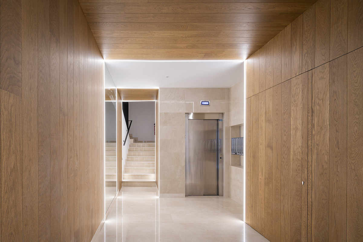 Interiormente, se ha modificado la distribución para conseguir una vivienda por planta, como resultado, se han obtenido 7 pisos de superficies cercanas a los 200 m2. Al mismo tiempo, las estancias cuentan con una iluminación muy estudiada creando un ambiente cálido y confortable en horarios nocturnos, algo que en horarios diurnos se ve favorecido por la abundante luz natural que invade todas las estancias.