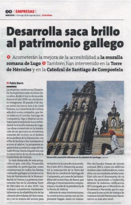 The article recognizes several Desarrolla´s works in Galician Heritage of Humanity, as the Hercules Tower, The Cathedral of Santiago de Compostela and the nowadays town hall of Santiago “Pazo de Raxoi”. This refers to the recent contract awarded for the Roman Wall of Lugo too.