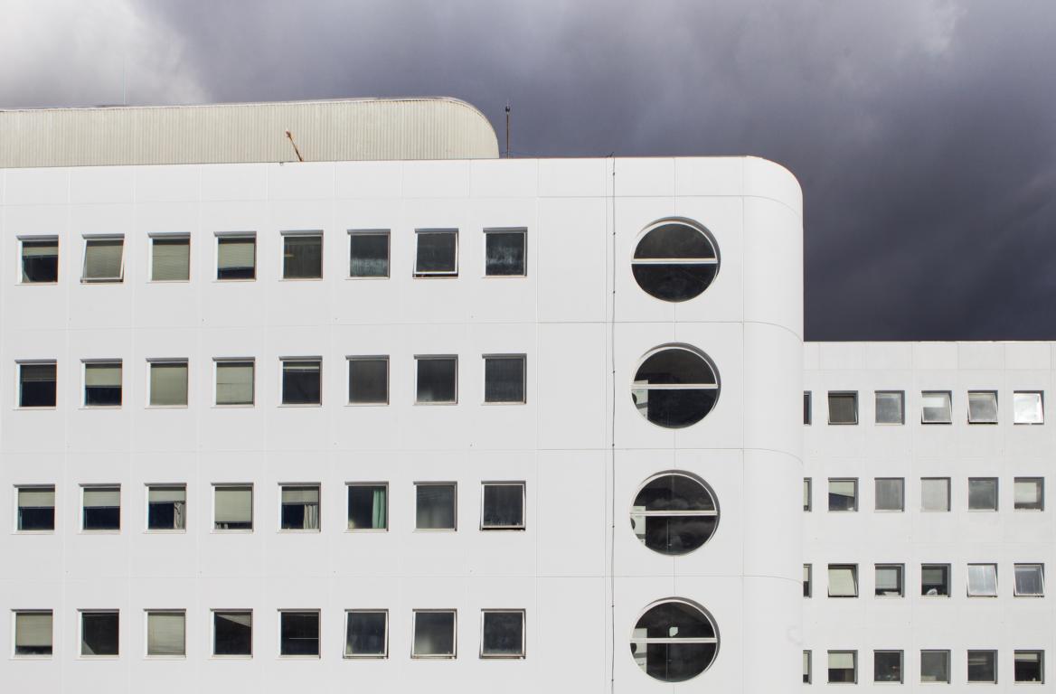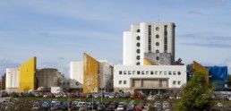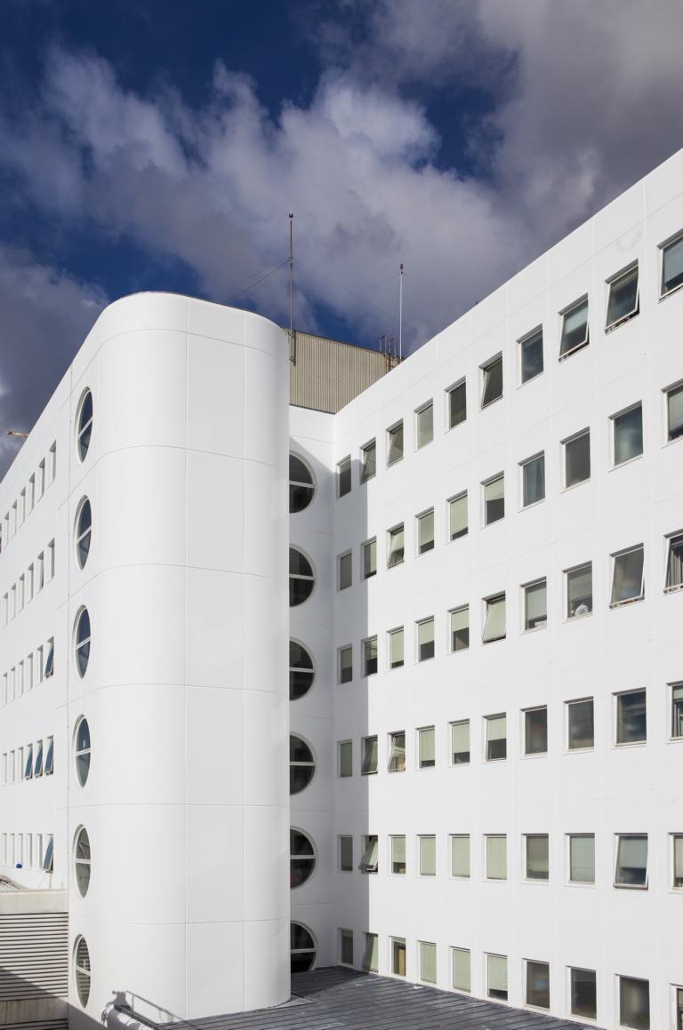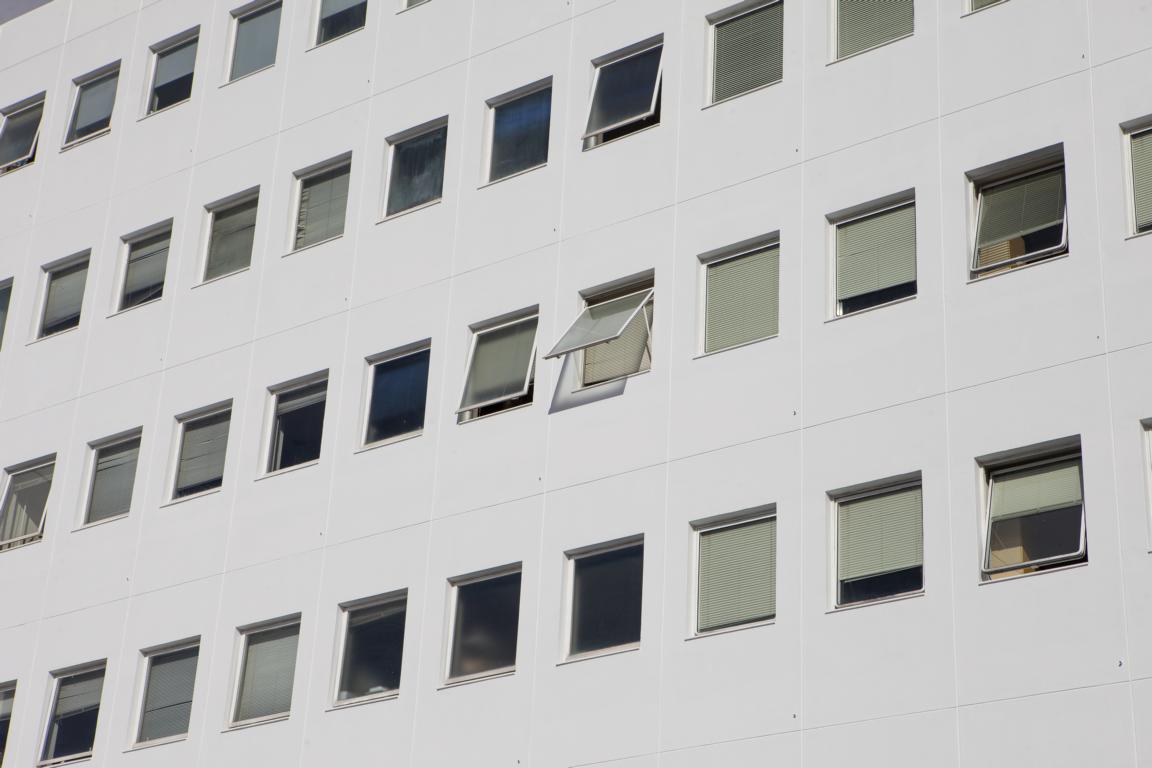 Renovation and maintenance works on the south facade of the Meixoeiro Hospital in Vigo, Pontevedra.