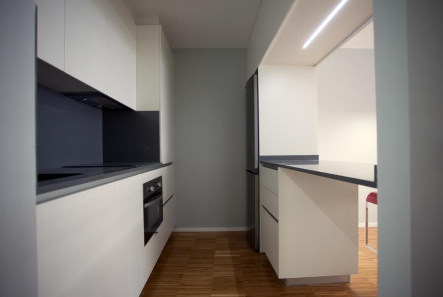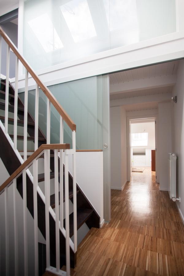 The new materials used for the interior cladding are plasterboard paneling painted in white and oak floating floorboards.