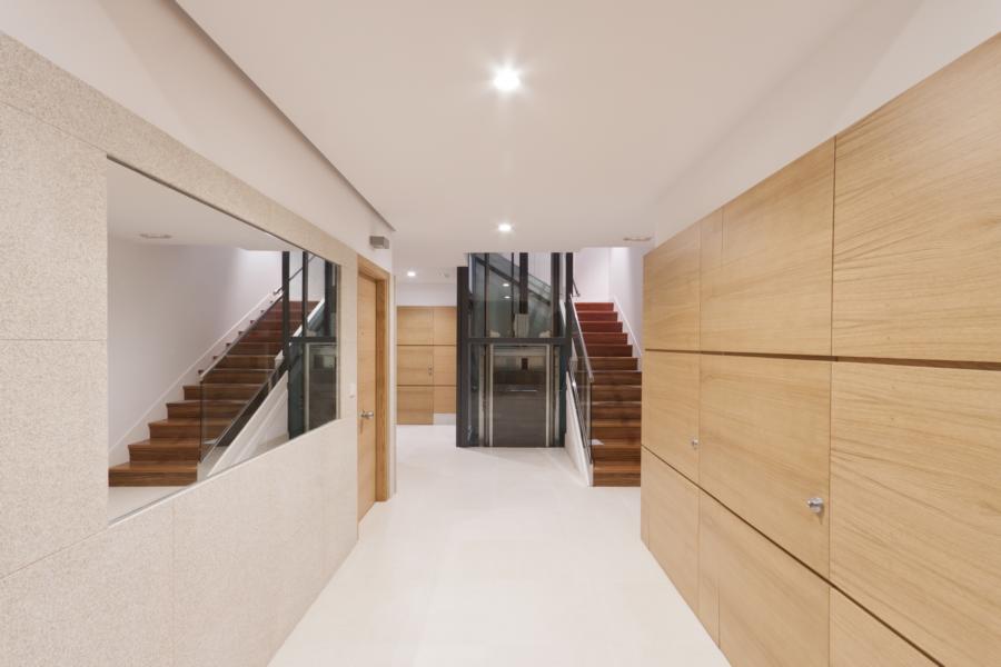 Inside the building, a lift has been installed with a stadip-type glass enclosure, allowing natural light to enter the stairwell through a skylight.