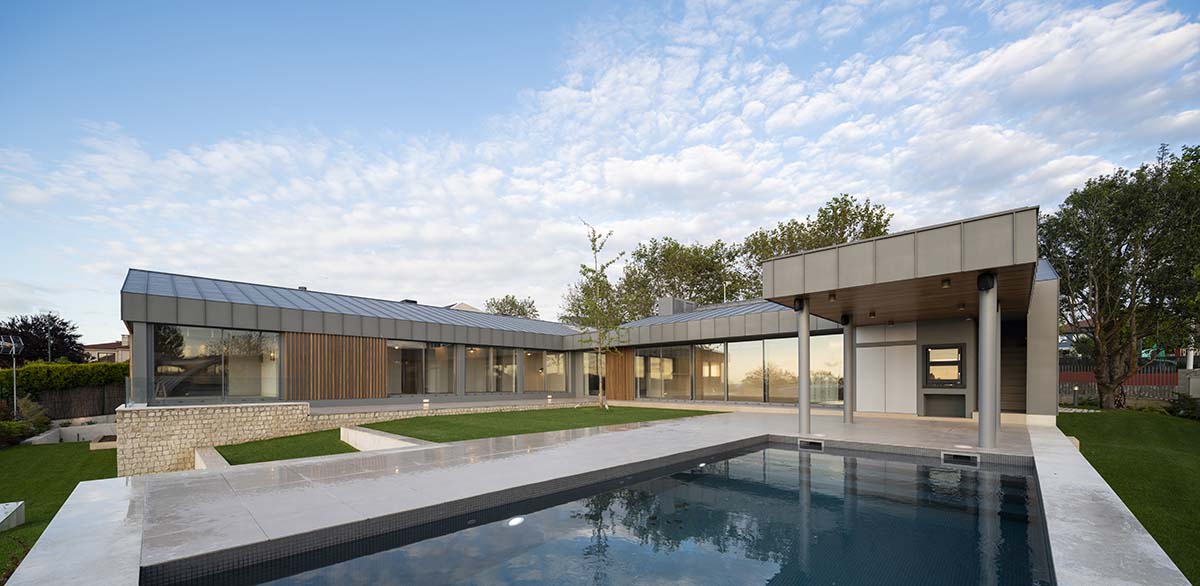 La gran intimidad de la que se disfruta en el interior no va en detrimento del aspecto exterior de la vivienda, también muy cuidado. Al acceder a la propiedad, la construcción luce tras un cuidado jardín transmitiendo rotundidad gracias a la continuidad visual del Zinc que lucen fachada y cubierta. La madera de iroko y la piedra caliza portuguesa – que encuentran continuidad en el interior – aportan a su vez un punto de calidez en los exteriores.