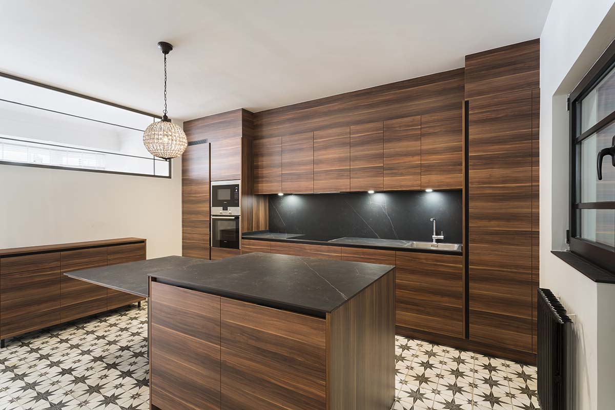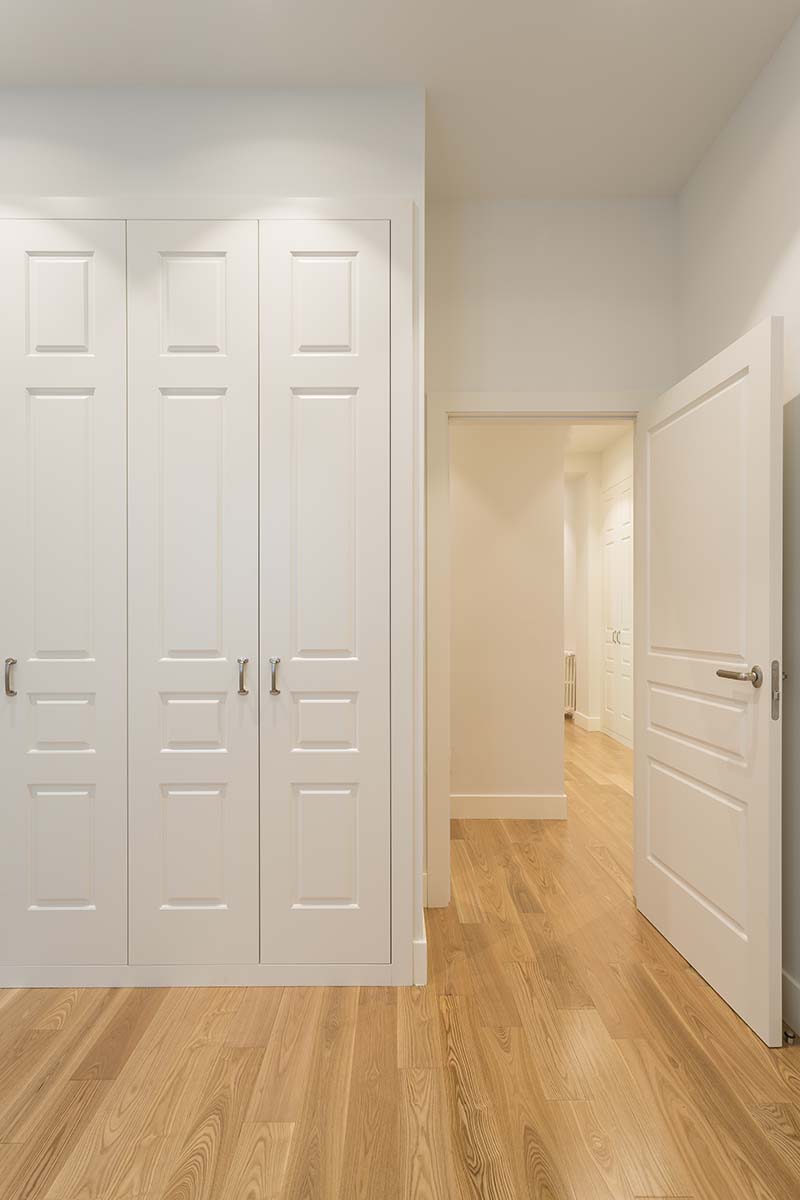 En las carpinterías, se ha optado por mantener los diseños originales en madera maciza lacada que, junto al suelo, de madera maciza de roble, mantiene presente ese toque de tradicionalidad que envuelve el entorno.